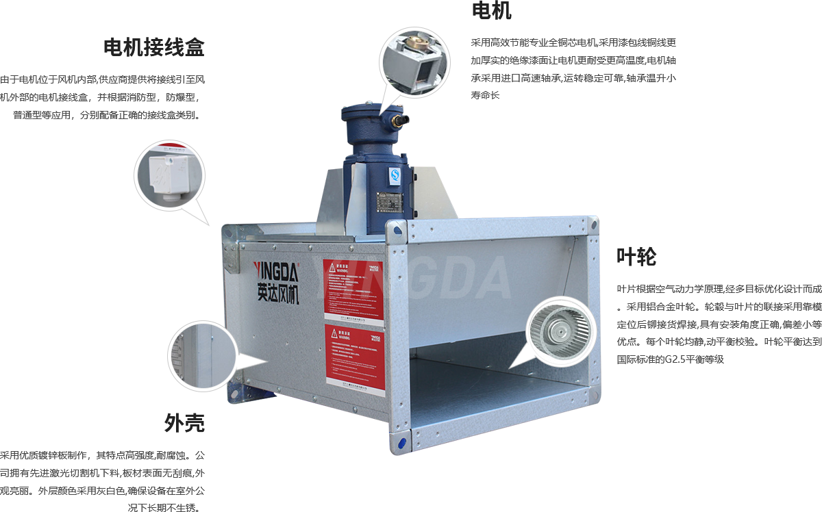 由于電機位于風(fēng)機內(nèi)部,供應(yīng)商應(yīng)提供將接線引至風(fēng)機外部的電機接線盒,并根據(jù)消防型、防爆型、普通型等應(yīng)用,分別配備正確的接線盒類型。