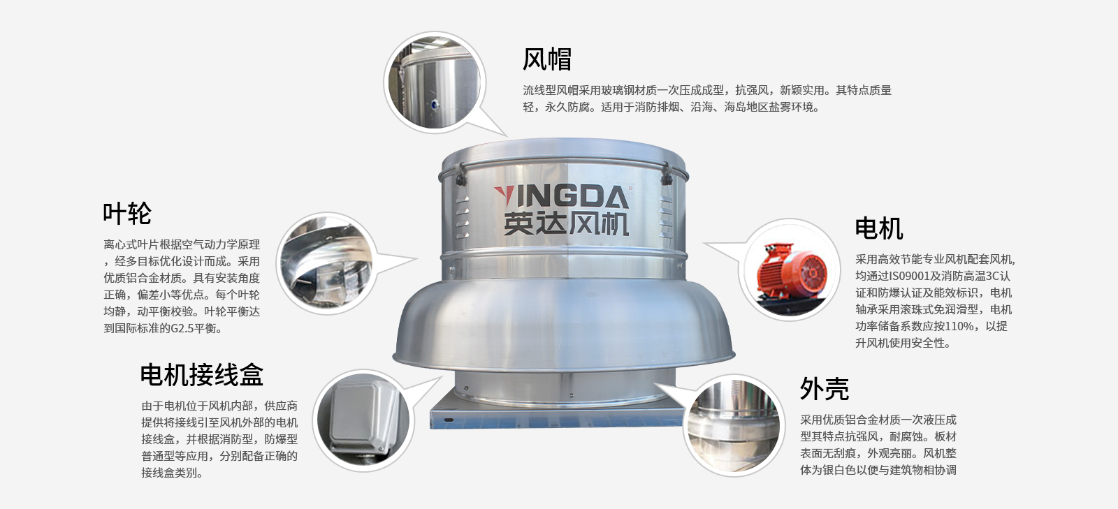 英達風機采用生產電機生產設備和檢查手續(xù)齊全的風機專用配套電機,均通過ISO9001及消防高溫3C認證和防爆認證及能效標識。電機應與風機負載緊密配合,采用B3安裝結構。電機防護等級為IP54,絕緣等級F級,溫升等級B級。電機軸承應為滾珠式免潤滑型。電機功率儲備系數應按110%取,以提升風機使用的安全性。