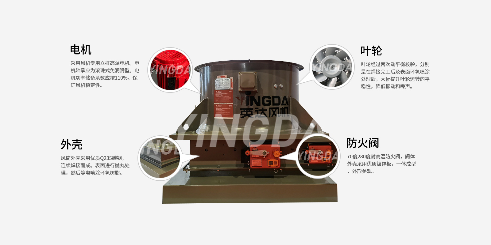 1.1.DWT(HTF)型軸管廊消防排煙,其基本形式為軸流屋頂式結(jié)構(gòu),電機(jī)采用耐高溫電機(jī),產(chǎn)品按GA211-2009《消防排煙風(fēng)機(jī)耐高溫試驗(yàn)方法》進(jìn)行耐高溫試驗(yàn),通過公安部消防產(chǎn)品合格評定中心3C強(qiáng)制性認(rèn)證,可在介質(zhì)溫度280℃。高溫條件下連續(xù)運(yùn)轉(zhuǎn)30分鐘以上,100℃溫度條件下連續(xù)20小時(shí)/次不損壞,可通風(fēng)排煙兩用。