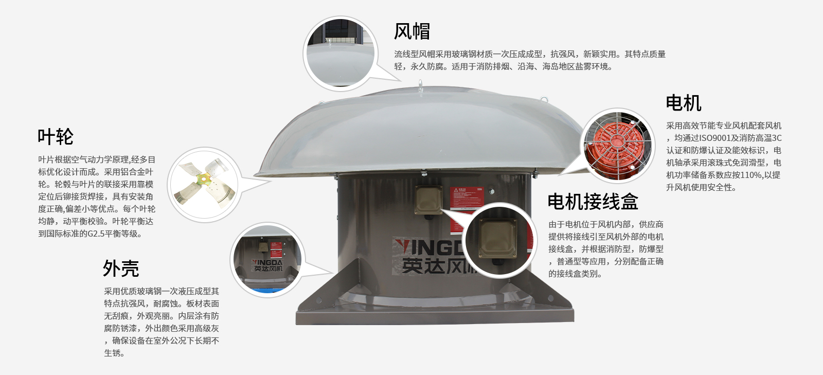 ●機(jī)殼(風(fēng)筒、電機(jī)支架); ●玻璃鋼風(fēng)帽。